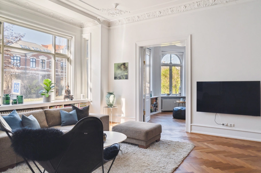 Stuen byder på en prangende lejlighed, på i alt 196 kvm med køkken/alrum, stue, 4 værelser, bryggers og 2 badeværelser.
