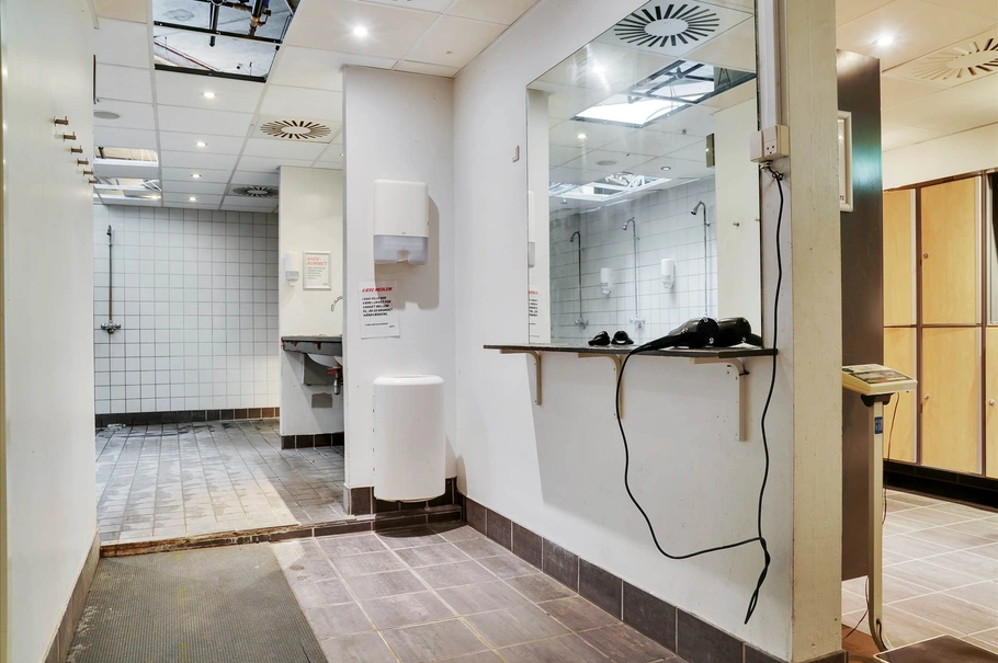 Ejerlejligheden er indrettet til brug for fitnesskæden med en blanding af glatte gipslofter og flådelofter over hvilke både lys, ventilation og brandsikringsinstallationer er trukket. Væggene er filtede og malede og gulvene er belagt med enten linoleum eller træparket.