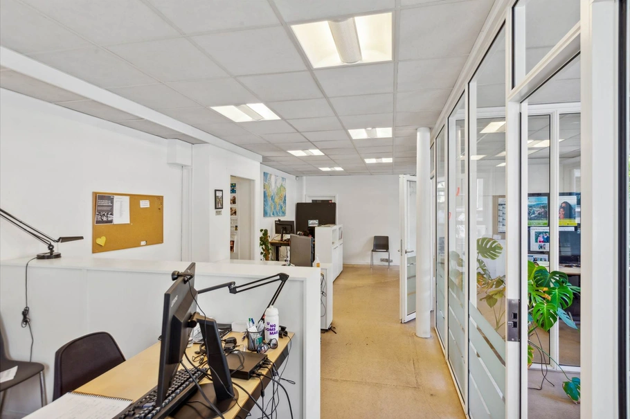 Boligen har indgang fra døren beliggende ved indkørsel og leder op til boligens areal på 1. sal. Lejligheden har 4 værelser og er delvist moderniseret, men har et yderligere forbedringspotentiale. Erhvervsarealet spreder siger over både stue og 1. sal og er indrettet til alment kontorformål. Hoveddøren befinder sig ved parkeringspladserne bagom bygningen og leder en til en entre. Fra entreen bliver man ledt ind i et receptionsområde der ligger overfor kontorlokaler, som er opdelt af glasvægge. Yderligere på etagen finder man et tekøkken, mødelokale og toiletter. 1. sal er opdelt i 2 hovedsagelige lokaler; stort mødelokale og åbent kontorlokale. Derudover finder man et funktionelt køkken, samt toiletter.