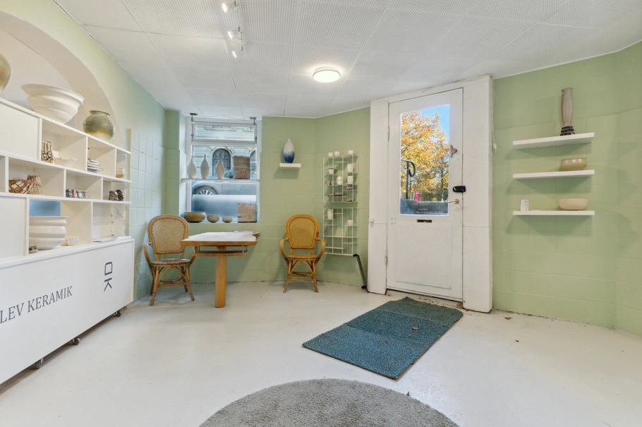 Erhvervsejerlejligheden er indrettet med ankomstområde med god plads til udstilling og reception. I forlængelse heraf er to store lokaler til brug for undervisning, et rum indrettet til keramikovne og et rum til tørring af keramik med udsugning.