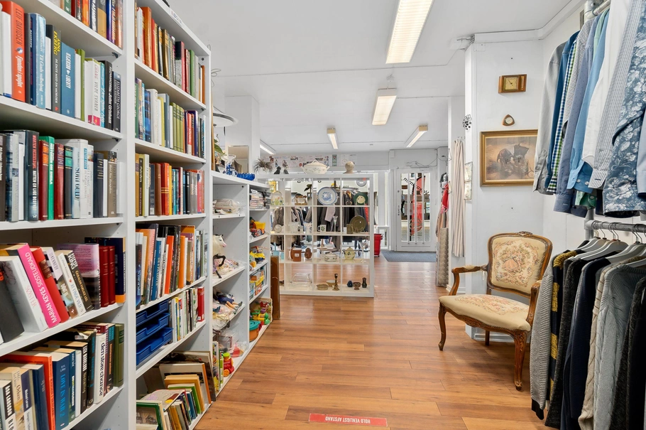 Erhvervsdelen, der har været lejet ud til samme lejer siden 2012, fordeler sig på 107 kvadratmeter, og rummer et stort butikslokale, et køkken, et mindre kontor, et toilet og et depotrum. Derudover er der også en kælder, som er istandsat til lagerbrug.