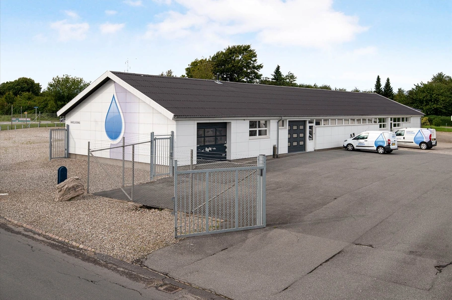 Erhvervsdelen udgør 447 m² er for halvdelen opdelt i storrumskontor samt 3 selvstændige kontorer/mødelokaler, køkkenområde og toilet. Den anden halvdel af erhvervsdelen er fordelt på lagerlokaler/garage med rulleporte samt et rum med dobbeltdør, der p.t. anvendes til natleverancer til virksomheden. Kontorområdet fremstår i meget god stand, der er et godt lysindfald fra de mange vinduer, systemloft med LED-belysning og nyere tæppefliser på gulvet.