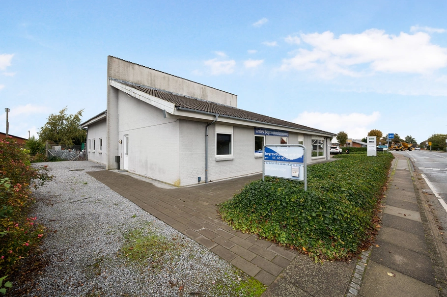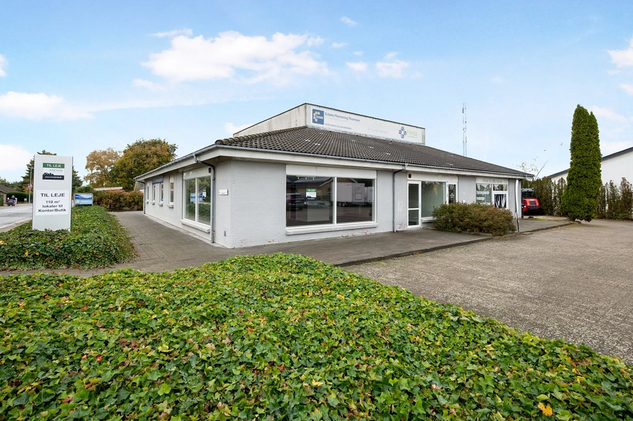 Attraktiv butik/kontor/værkstedsejendom med 4 lejemål ved Årslevs industrikvarter, synligt beliggende og med kort afstand til motorvejen.