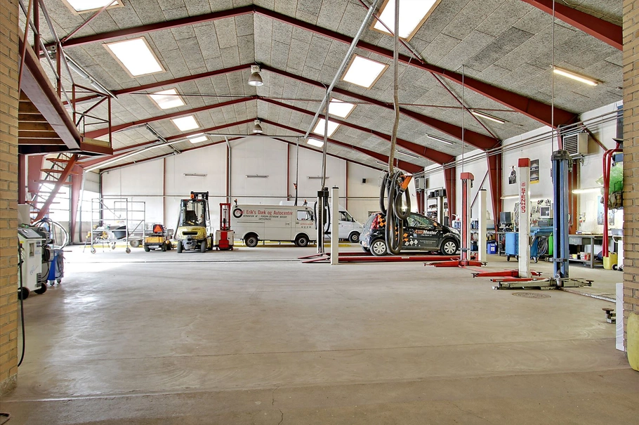 1. Stort funktionelt autoværksted med 2 lastvognsgrave samt en alm. grav. og 3 vippeporte. Loftshøjde i kip er 8 meter, der er ovenlys og loftet er beklædt med trolltex. Endvidere moderne kontorer og personalefaciliteter med klinkegulve og gulvvarme. Denne bygning er fuldt udlejet til Arriva.