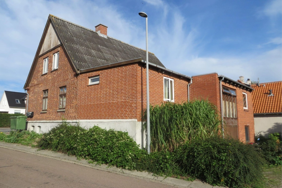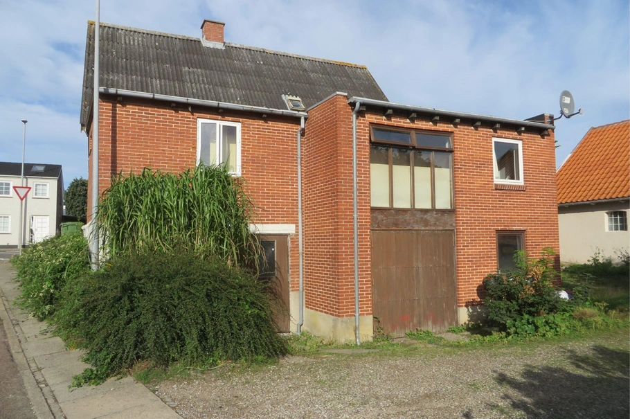 Fritliggende 2-plans bygning opført med facader af røde sten og med bølgeeternit/tagpaptag.