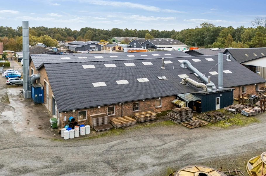 Derudover medfølger uopvarmet lagerhal og en opvarmet produktionshal:Lagerhallen er uisoleret og uopvarmet på 384m². Gulv af beton, og der er portadgang.Produktionshallen er en nyere, isoleret og opvarmet hal fra 2009 på 528² - også med portadgang.