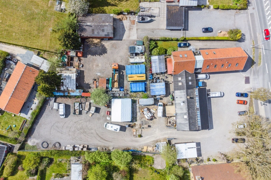 Til ejendommen hører et stort udeareal, der anvendes til parkering foran bygningerne, samt yderligere areal bag ejendommen, som pt. benyttes af den nuværende lejer. Disse arealer giver fleksibilitet til både erhvervsmæssig og privat brug.
