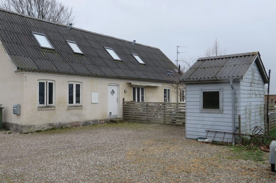 Fritliggende 1-plans bygning med udnyttet 1. sal. Opført med pudsede, malede facader og med bølgeeternittag.