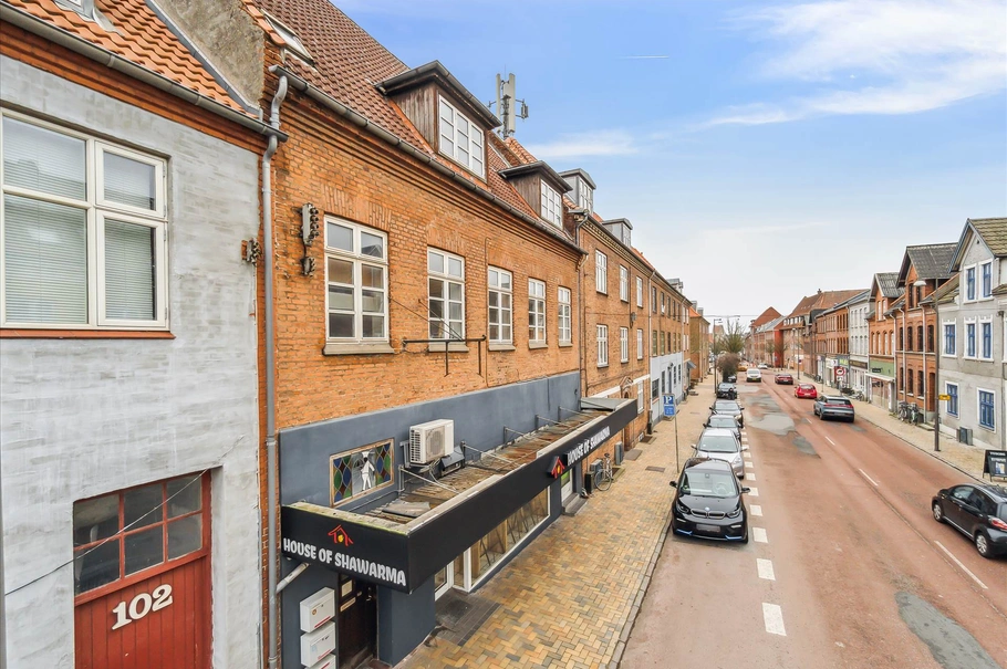 Typisk ejendomstype for handelsgaden Skibhusvej, indrettet med erhvervslokale i stueetagen og to boliglejemål på 1. og 2. sal.
