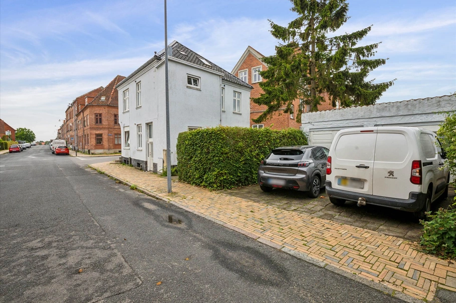 Udearealet er flisebelagt og rummer to parkeringspladser foran garagen.