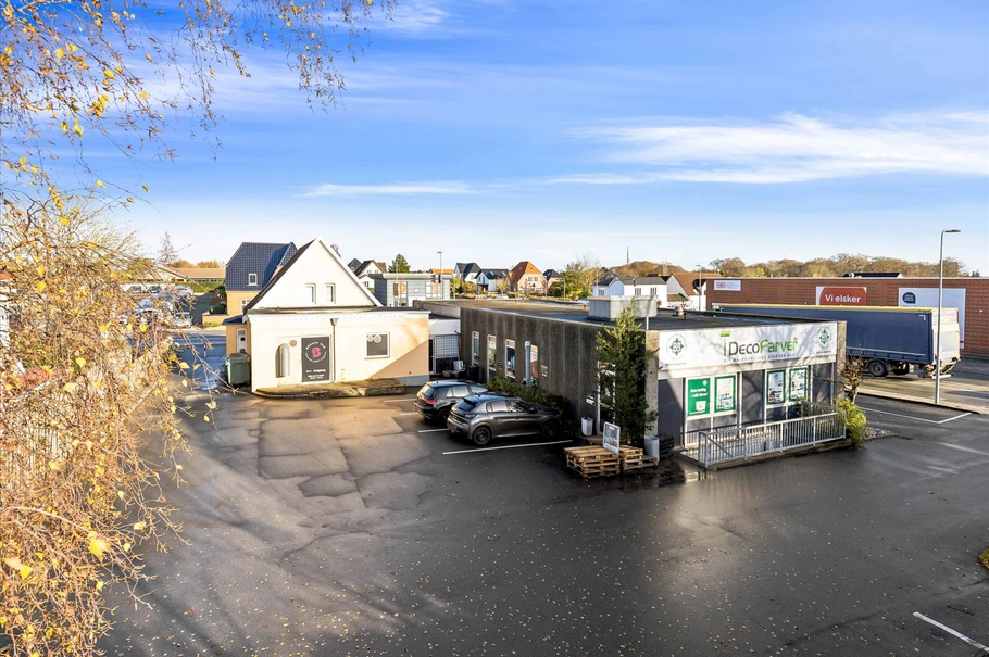Ejendommen er og har igennem de sidste mange år været udlejet til de samme lejere, som er bestående af en farvehandel, en frisør samt et solcenter. Bygningen hvori solcenteret er beliggende, fremstår med gulpudset facade og med sadeltag belagt med tegltagsten. Indvendigt er bygningen indrettet med flere mindre kabinerum og et modtagelsesområde. Der er ligeledes en 1 sal ovenpå solcenteret, som lejer har fremlejet ud.