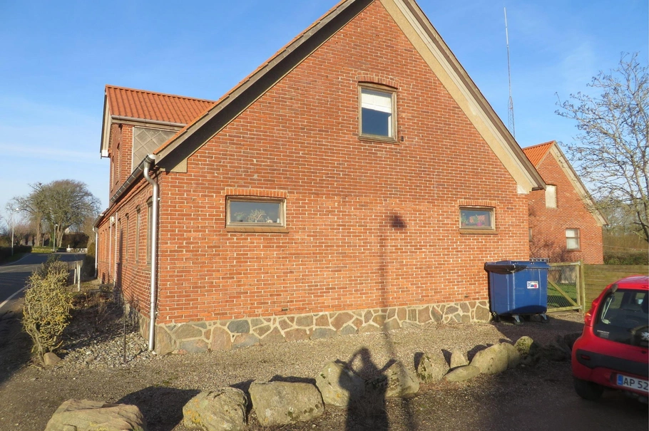 Fritliggende 1- og 2-plans bygningskompleks, opført af røde sten og med bølgeeternittag.