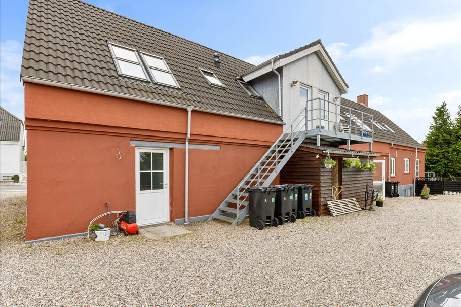 Vel vedligeholdt bygning opført i teglsten. Den del af bygningen med erhverv i stueetagen er med pudset og malet facade. Den sammenbyggede bygning består tillige af en rødstensbygning.