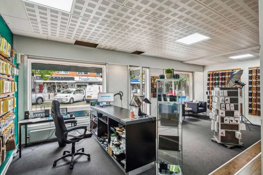Bygningen er fuldt udlejet med 2 butikslejemål i stueplan og 1 bolig på 1. sal.
