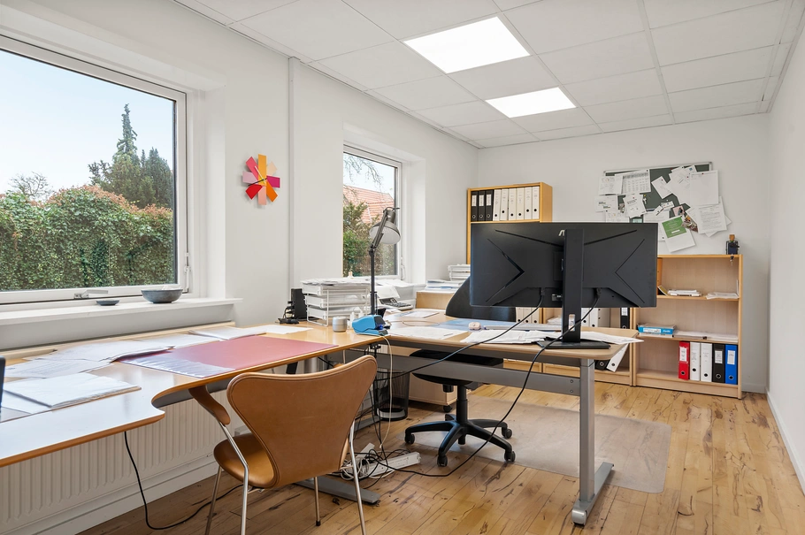 • Bygning 3: Beliggende bagerst på grunden og udlejet til et malerfirma. Her findes et præsentabelt møde- og køkkenareal, to kontorer med masser af dagslys samt toilet. Derudover er der et mindre lager til malerfirmaets brug.