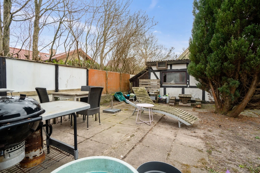 Selve hovedhuset fremstår i velholdt stand, med tag belagt med tagpap, vinduer i plastrammer og udearealet er overskueligt at holde.