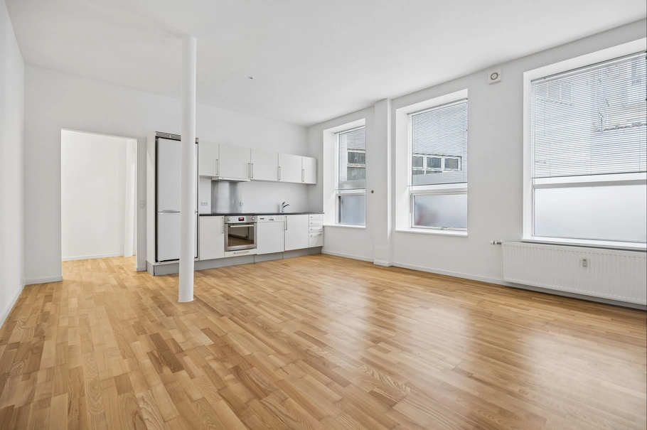 - Indbydende opholdsrum med moderne, åbent køkken i direkte forbindelse med stuen