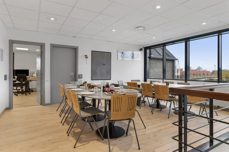 Bygningen er i 2 plan og den indvendige indretning består af en kombination af kontorlokaler i varierende størrelser, mødelokaler, toilet og køkkenfaciliteter med tilhørende spiseområde. Gulvene er en kombination af trægulve og klinker. Flot indgangsparti med godt lysindfald og stor trappe til 1. sal.