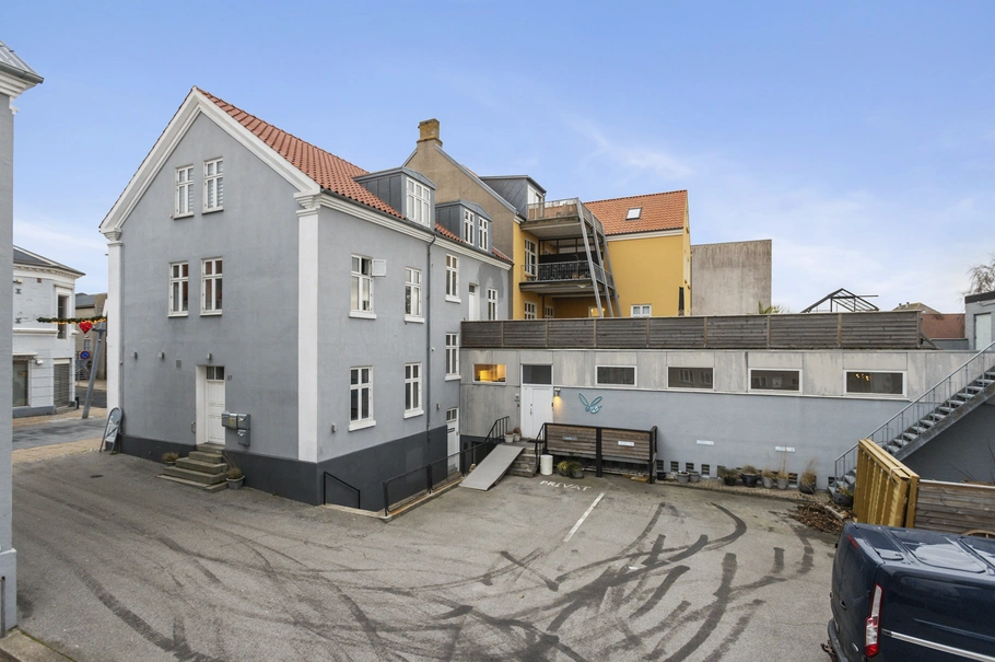 I stueplan fordeler ejendommen sig med 2 erhvervslejemål på henholdsvis 129 m² og 89 m². På 1. sal er der en 129 m² bolig, og på 2. sal en lejlighed på 95 m². Lejligheden på 1. sal fremstår flot og lys og er indrettet med entré, værelse, badeværelse, soveværelse med udgang til altan, køkken, stue og spisestue. Lejligheden på 2. sal fremstår ligeledes flot og lys med soveværelse med walk-in, toilet med bad, stue, køkken og entré.