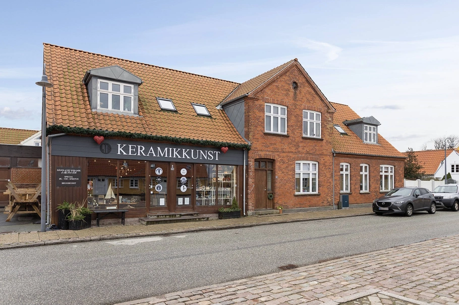 Erhvervslokalet er udlejet til galleri/butik og er indrettet med stort butiksområde, thekøkken, kontor/personalerum og toilet. Lokalet har en fantastisk facadeværdi og er indrettet med store vinduespartier, der vender direkte ud mod vejen.