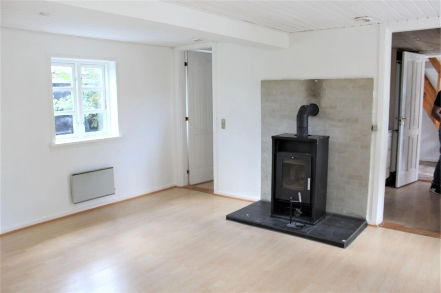 Baghus 74 m²: Entré m trappe til 1. sal- Badeværelse med bruseniche - Køkken - Stue med brændeovn og udgang til gården - Værelse - 1. sal er indrettet med et værelse - Fordelingsgang - Soveværelse. På 1. sal er der ligeledes synlige bjælker.
