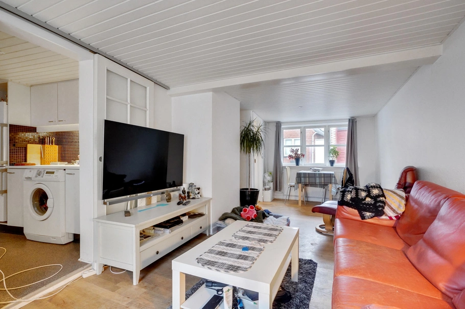 I stueplan er der soveværelse, badeværelse, stue med udgang til gården samt køkken med adgang til 1. sal. Hele første salen er et stort rum med loft i kip.