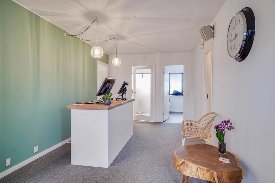 -Egedal Fodterapi på 1. sal med en klinik på 75 m², med venterum, reception, 3 gode klinikrum, samt personalekøkken og toilet.