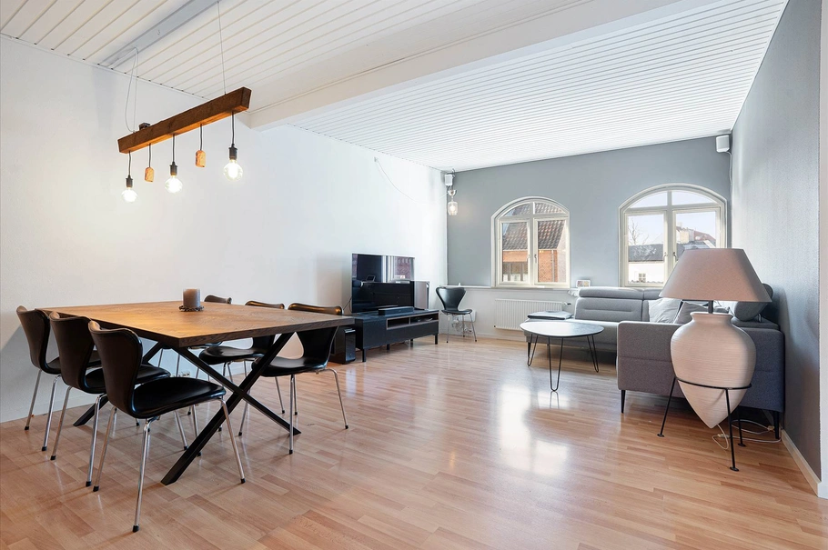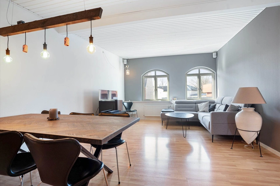 På førstesalen findes et indbydende 3-værelses beboelseslejemål med en velfungerende indretning, herunder to soveværelser, et fuldt udstyret køkken, et rummeligt badeværelse og en hyggelig stue i kombination med køkkenalrummet. Til beboelseslejemålet er desuden en stor træterrasse med udsigt over nærområdet. Lejemålet er i god og velholdt stand, og har for nylig fået sat nye energivenlige vinduer i.