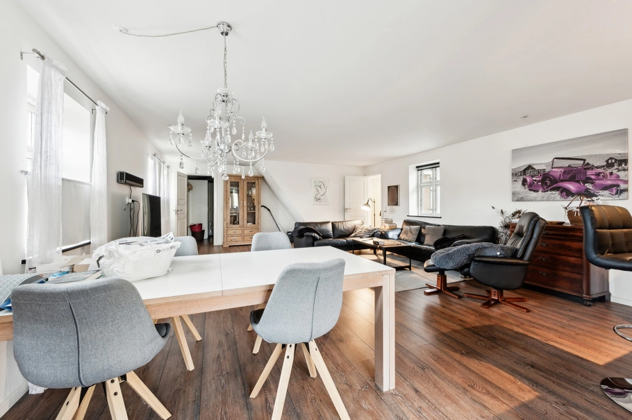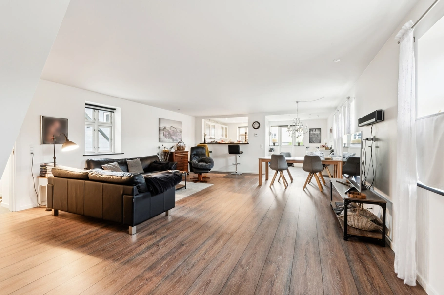 Også selve boligen fremstår i rigtig flot stand. 166 m2 fordeler sig over to plan, hvor 1. sal rummer et værelse og en stue. Nede i stueetagen finder du endnu et værelse, og herefter kommer køkkenet og stuen, der ligger i åben forbindelse. Boligen afrundes med et lækkert og moderne badeværelse med masser af plads. Alt i alt er der tale om en lys, velholdt og præsentabel bolig, som er lige til at gå til.