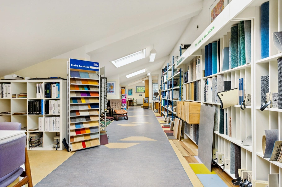 Ejendommen der er opført i 1985 er løbende moderniseret bl.a. med nyt tag i år 2009. Ejendommen rummer udover en bolig på 160 m² i dag også en gulvvirksomhed. Her er registreret 561 m² erhvervsareal samt yderligere udhus på 84 m² og en udestue på 24 m². Samlet er der i alt 829 m².