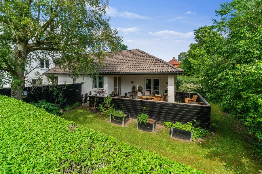 • Moderne villa på 130 kvmmed stor overdækket terrasse og opvokset have til købers disposition