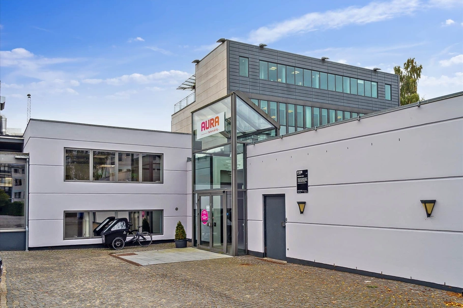 Ejendommen ejes og bruges af AURA, primært som kontordomicil, herunder med kundevendte funktioner i stueplan, samt kælder til bl.a. arkiv, teknik og lager. Den bagerste del af bygning 1 (i ét plan) anvendes til lager, men vil kunne indrettes til kontor eller lignende. Her er elevator, der går fra kælder til kvist (bygning 1) og en moderne aptering enten med gulvtæppe, belagte gulve eller trægulve. Lofterne er af lyddæmpende plader (enten rockofon eller metal) med indbyggede lysarmaturer, mens væggene er af gips. Der er som udgangspunkt tekøkken og toiletter på hver etage, ligesom der er en større fælles kantine. Indretningen med mødelokaler, storrums- samt mindre kontorer er let at ændre til andre krav/behov herunder evt. til flere brugere. Hele huset er ventileret. Forsiden af bygningen (mod solsiden) har desuden automatiske solgardiner.