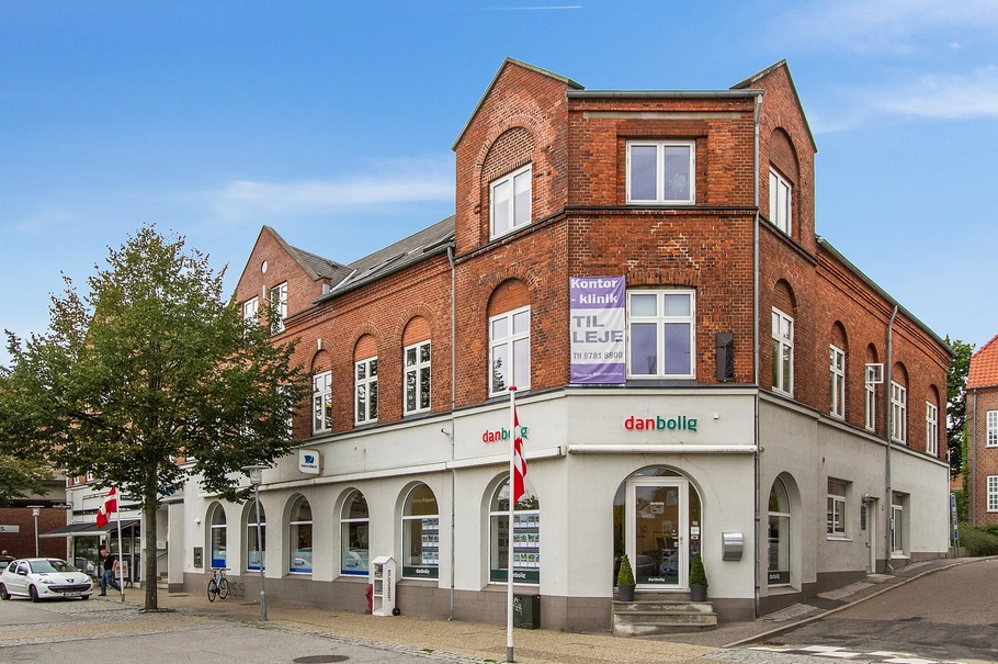 Bebyggelsen er opført i år 1903 og indeholder i dag 5 kontorlejemål i varierende størrelser (et kontor på ca. 118 m² pt. under udlejning), en større Nordea Bank filial, 2 boliglejemål hvoraf en ledig bolig på ca. 93 m² samt det tidligere bageri som ligeledes er under udlejning/projektmulighed for køber.
