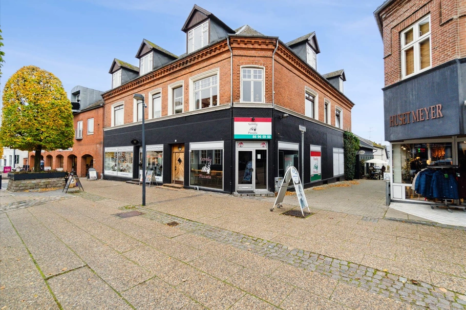 Her er et samlet erhvervsareal i stueplan på 240 m² der er opdelt i 2 enheder og udlejet til hhv. livsstilsbutik og pizzaforretning. Begge lejere har en længere