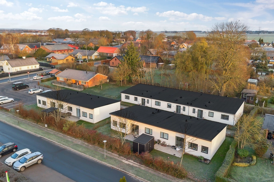 De nye rækkehuse er opført i moderne, hvidpudset arkitektur med ensidig taghældning og tagpap. Boligerne indeholder to gode værelser, et rummeligt badeværelse samt et stort køkken-alrum. Hele bebyggelsen opvarmes via gulvvarme på fjernvarme. Der er gode parkeringsforhold til alle lejemål.