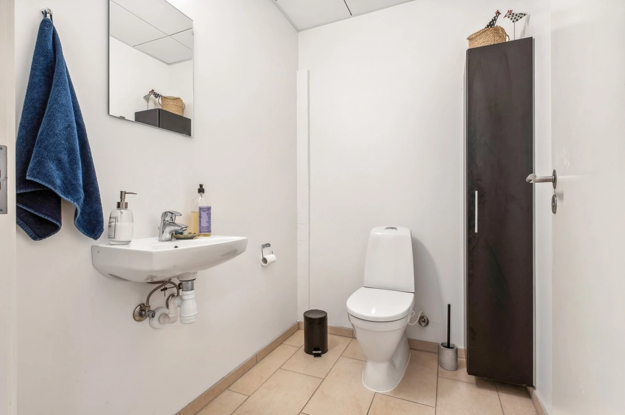 - Stort lager med toilet og badeværelse, velegnet til logistik eller opbevaring.