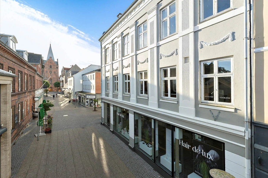En af de flotteste og mest præsentable ejendomme, beliggende med en stor synlighed i en af Grenaa´s gågader. Gode tilkørsels-forhold til ejendommen og de tilhørende parkeringspladser.