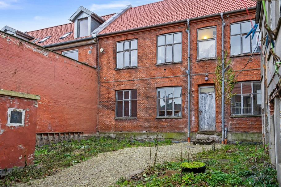 De to bygninger danner rammen om en gårdhave, hvor der også er en ældre erhvervsbygning.