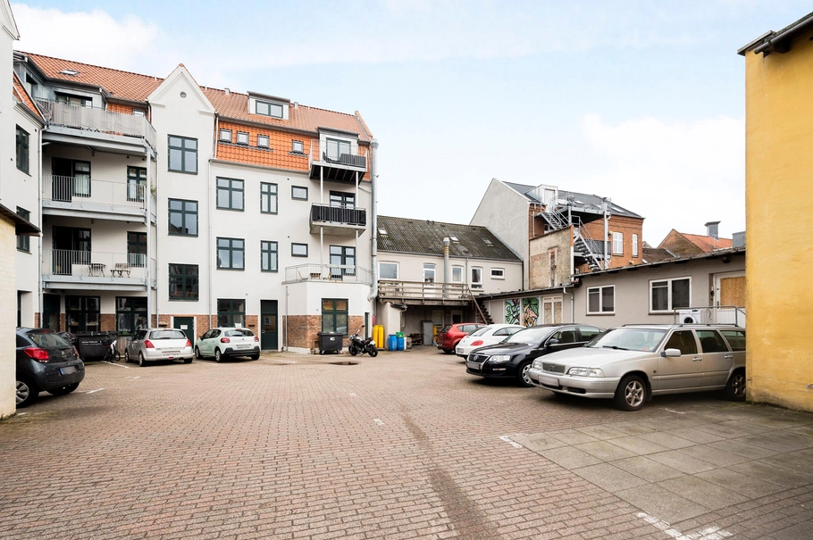 Man kan køre til ejendommen via port fra Markedsgade. I gården er der mulighed for parkering af biler.