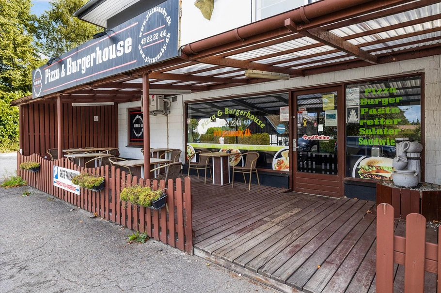 Erhvervsdelen er beliggende i stueetagen og bliver i dag anvendt som pizzeria. Bygningerne er i god stand, og lejlighederne fremstår velistandsatte.