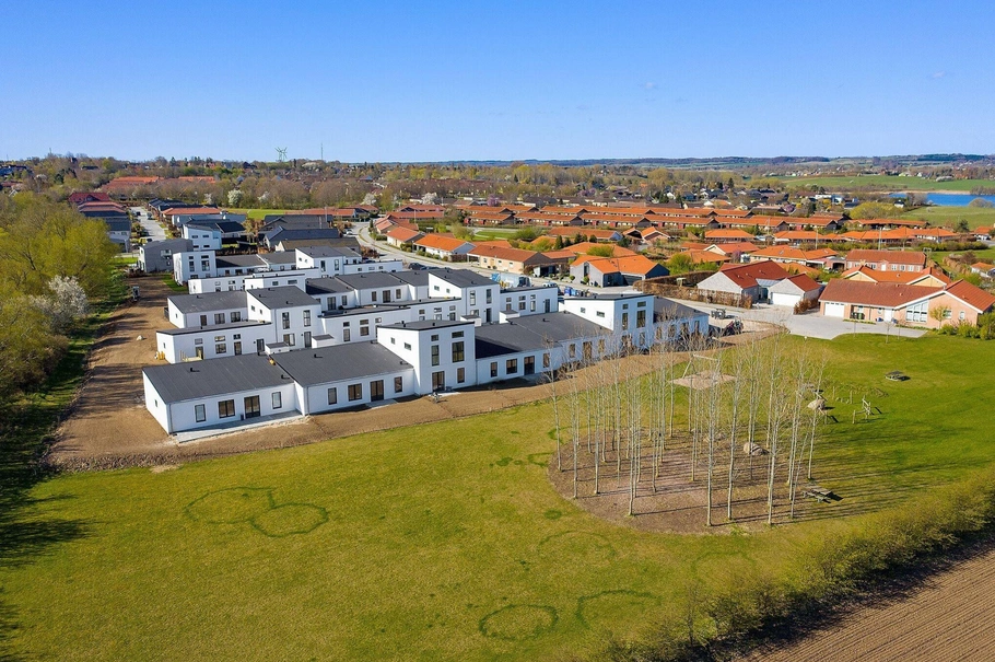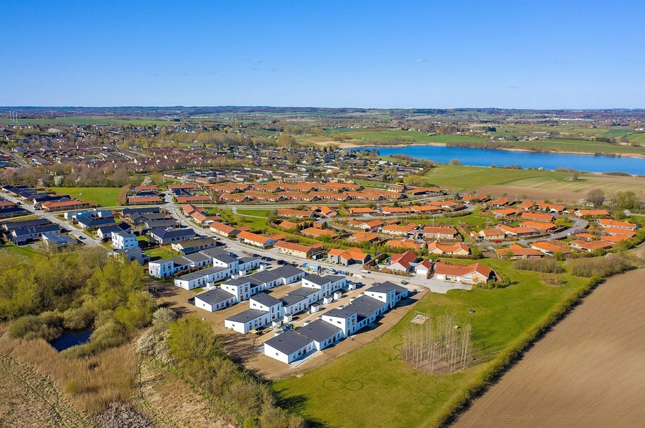 Boligerne er hvid pudset. Taget i sort tagpap, og vinduesrammerne i farven antracit.