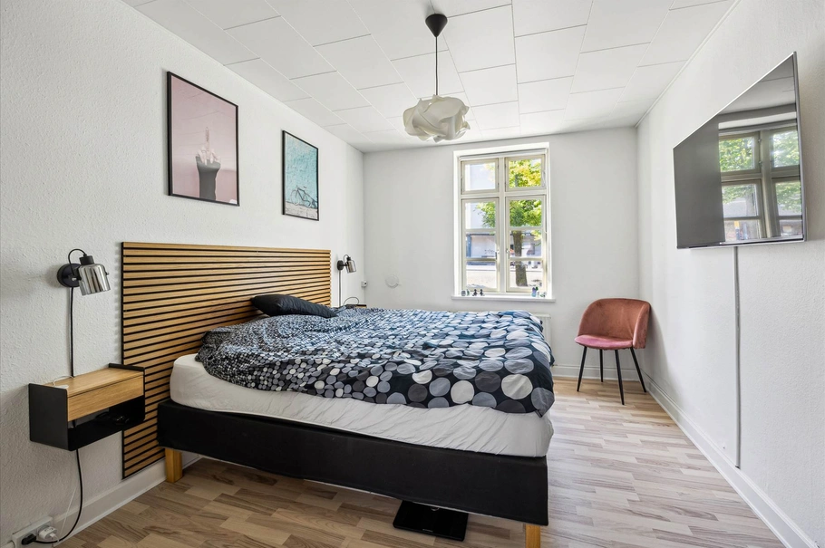 Ejendommens hovedbygning er beliggende ud mod Jernbanegade og rummer 1 erhvervsenhed og 3 boligenheder. Erhvervsenheden er udlejet til en frisør som nyder godt af den synlige beliggenhed. Den ene boligenhed er placeret på ejendommens 1. sal, mens de resterende toerbeliggende i stueplan. Den ene lejlighed på 43 m² er ny og ibrugtaget i 2021 og er konverteret fra erhverv til bolig, hvorfor den omfattesafreglerne om fri lejefastsættelse. Til ejendommens ene lejemål hører en super hyggelig og aflukket baggård. Endvidere er der plads til parkering af et par biler i ejendommens befæstede indkørsel.