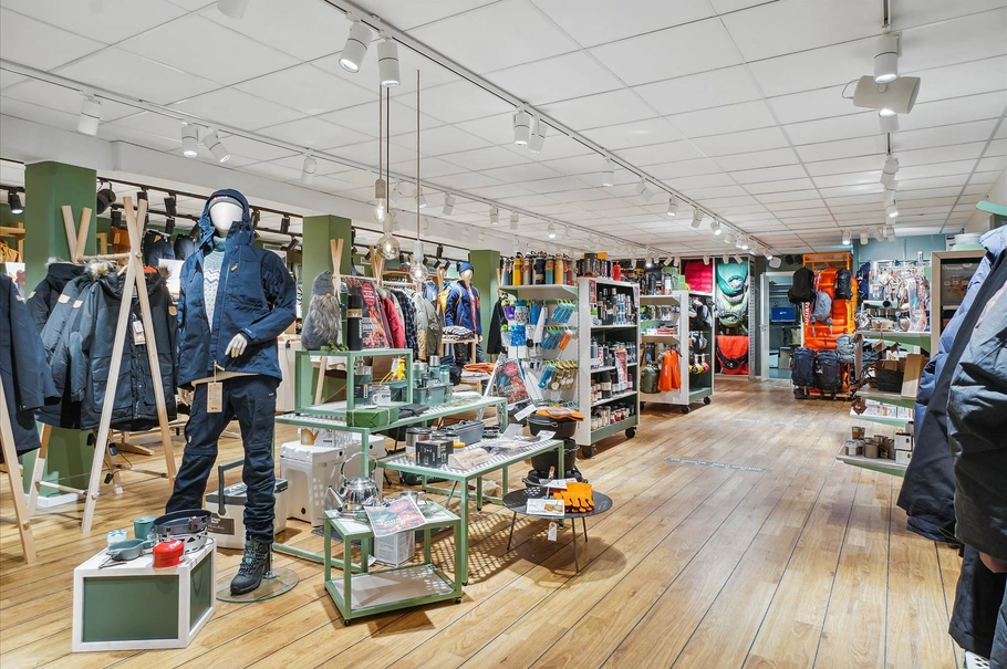 Ejendommens samlede erhvervsareal er på 1.673 m², fordelt mellem to butikker på 509 m² og 1.164 m².