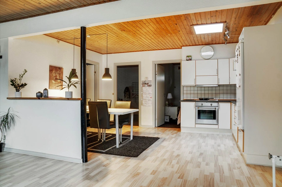 Lejemålet fremstår meget pæn og renoveret og indeholder mindre entre. Stue med pænt laminatgulv og udgang til terrasse. Åbent køkken med hvidmalede skabselementer med bøgekant.