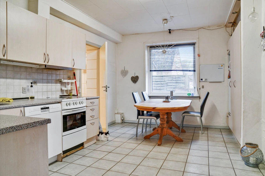 Lejemålet indeholder entré med garderobe, samt trappe til tagetagen. Stue med trægulv. Køkken med lyse skabselementer og klinkegulv med gulvvarme.