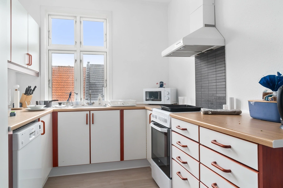 1.sal 68 m2: 2 værelser, et stort køkken af nyere dato og badeværelse. - Lejligheden fremstår flot.