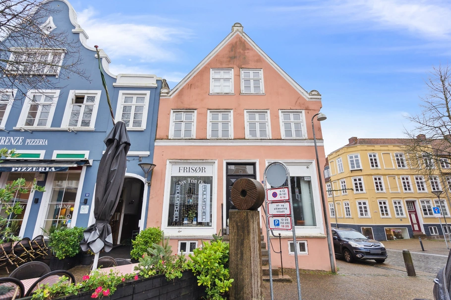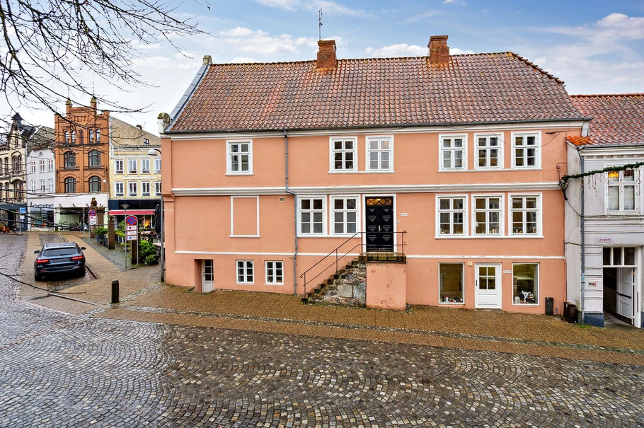 Ejendommen er blandt de ældste bygninger i Haderslev bymidte, opført i 1627 og 1877, og emmer af historie. Torvet i Haderslev, hvor ejendommen ligger, er kendt som Danmarks bedst bevarede middelalderlige plads, og fungerer i dag som byens levende centrum med caféer, butikker og aktiviteter. Dette gør ejendommen til et naturligt midtpunkt for både erhverv og beboelse.