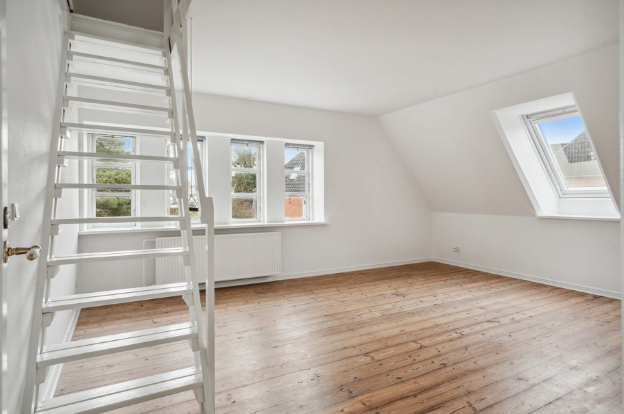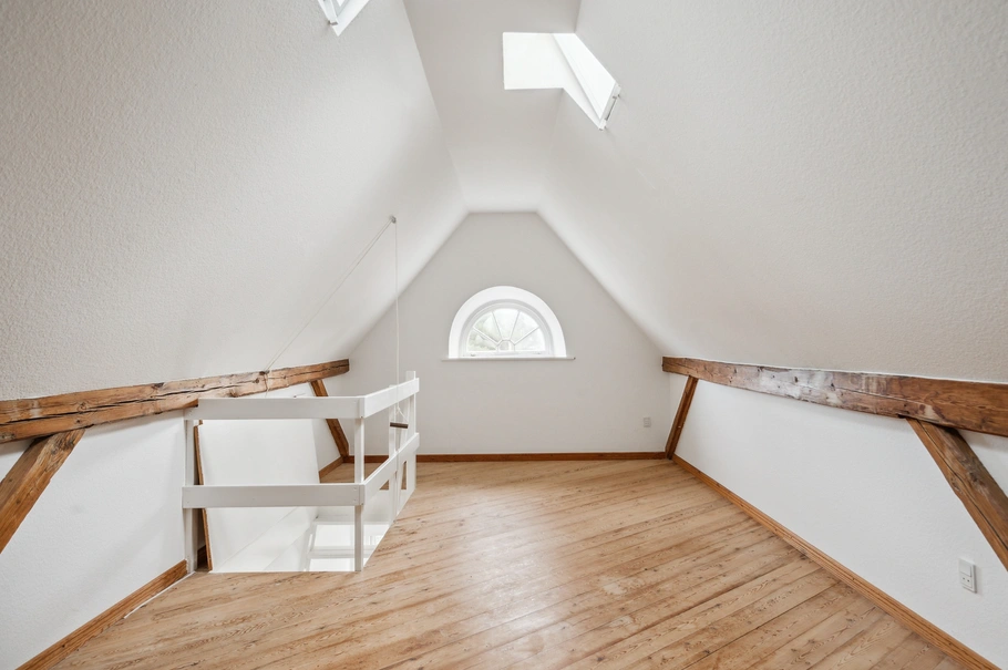 I tagetagen har vi en lejlighed på 70 m² som med de synlige træbjælker og søjler og skrå vægge har en særlig charme. Fra stuen går der en trappe til en stor hems, som kan bruges til kontor, musikrum eller andre hobbyinteresser.
