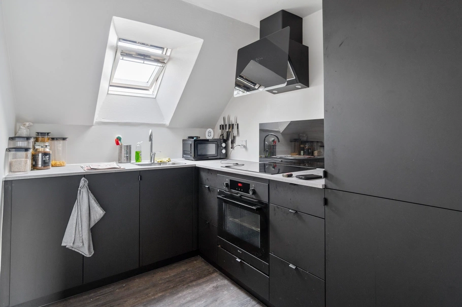 På 1. sal finder du en lys og rummelig lejlighed med repos, badeværelse, pænt køkken, stue og et stort soveværelse.