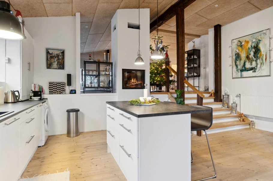 Spændende lejlighed med stort køkken/alrum, soverum og trappetrin op til stor vinkelstue. Pænt brusebadeværelse. Stor altan og nedgang til baghaven.Garage under 54B tilhører lejemålet.